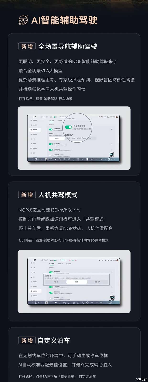 [本站 资讯] 日前,小鹏汽车官方宣布,小鹏G7 Ultra首次开启OTA推送。此次新增全场景导航辅助驾驶、人机共驾模式、自定义泊车、智能出库、AES自动紧急转向避让、AR-HUD路怒消消气、AR-HUD安全辅助、AR-HUD智能辅助、AR-HUD自适应调节高度等。详情如下: