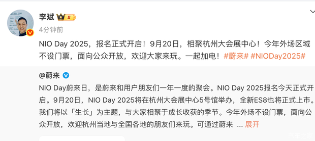 [本站 资讯] 日前,我们从官方获悉,2025蔚来NIOday将于9月20日正式举行,届时全新一代蔚来ES8也将正式公布售价。该车此前已经开启预售,共计推出3款车型,预售价格区间41.68-45.68万元,采用电池租用方案预售价为30.88-34.88万元。