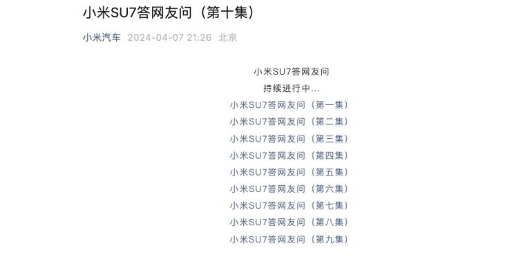 小米官方发布第十集小米SU7疑问解答