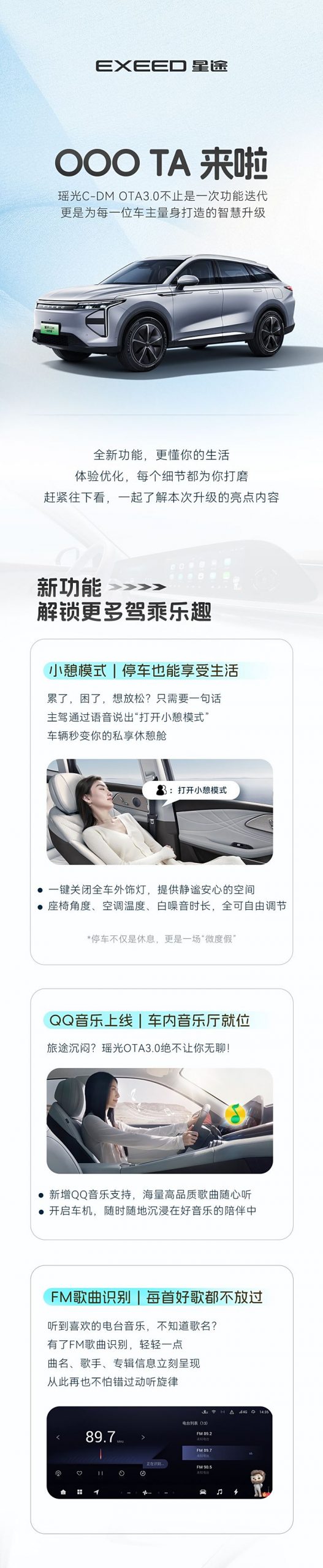 [本站 资讯] 日前,星途瑶光C-DM开启OTA 3.0升级,新增小憩模式、FM歌曲识别等,车机、电池管理系统、智驾也迎...