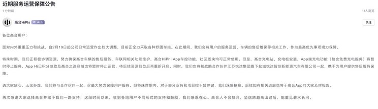 [本站 资讯] 2月22日,高合HiPhi官方在其官方App上发布《近期服务运营保障公告》,具体如...