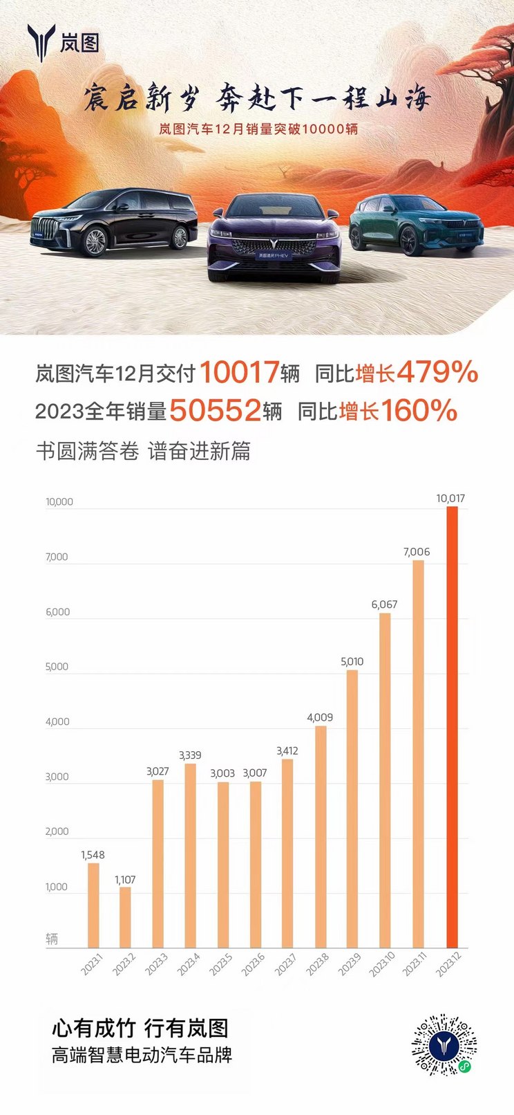 [本站 资讯] 2024年1月1日,岚图汽车公布2023年12月交付数据,其共计交付10017辆,...