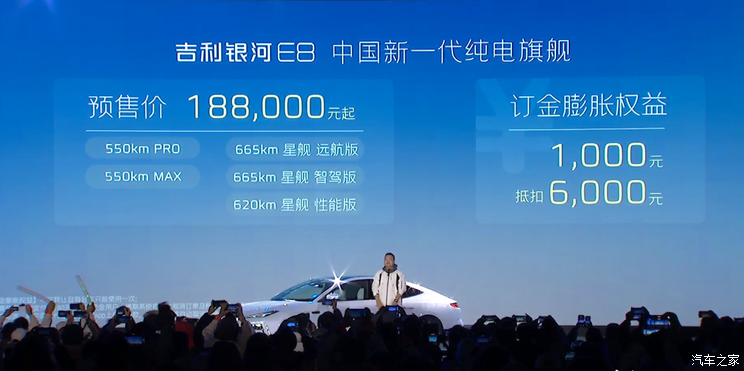 [本站 资讯]12月16日,吉利银河E8正式开启预售,新车共推出5款车型,预售价为18.8万元起。同时,购车用...