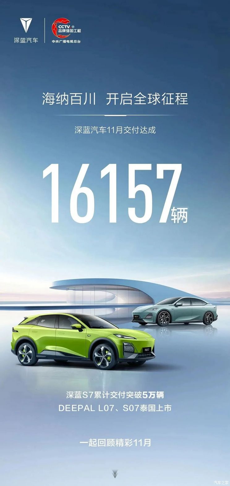 [本站 资讯] 12月1日,我们从深蓝汽车官方了解到,其11月交付达成16157辆。同时,深蓝S7...