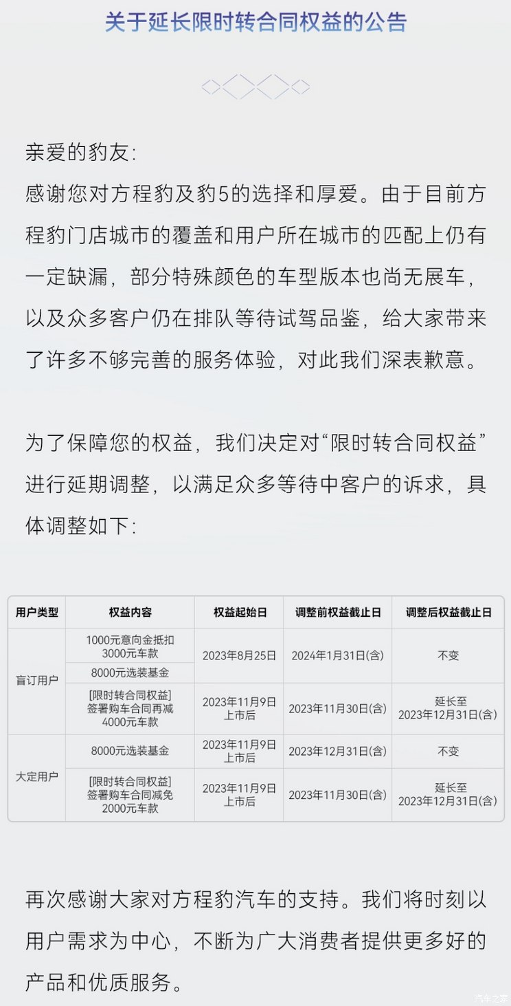[本站 资讯] 日前,方程豹汽车发布公告称,由于目前方程豹门店城市的覆盖和用户所在城市的匹配上仍有...