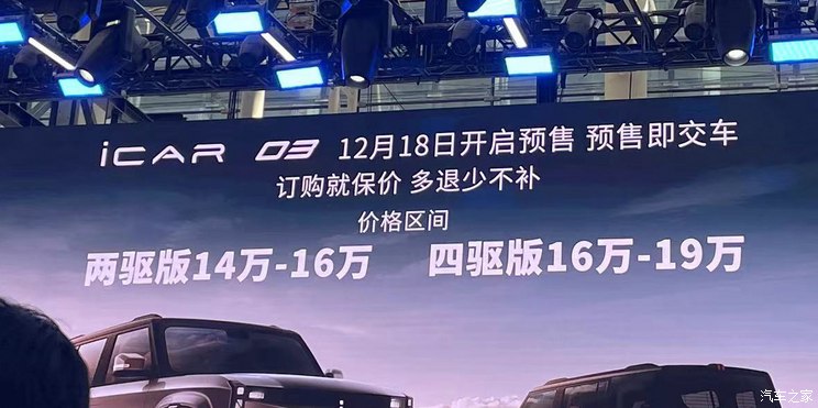 [本站 资讯] 奇瑞新能源iCAR 03的预售价在广州车展期间正式公布,两驱版为14-16万,四驱版为16-...