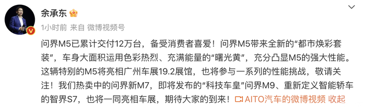 [本站 新车官图] 日前,华为余承东在其微博表示,问界M5“都市焕彩套装”将会在广州车展正式亮相,该车采用了...