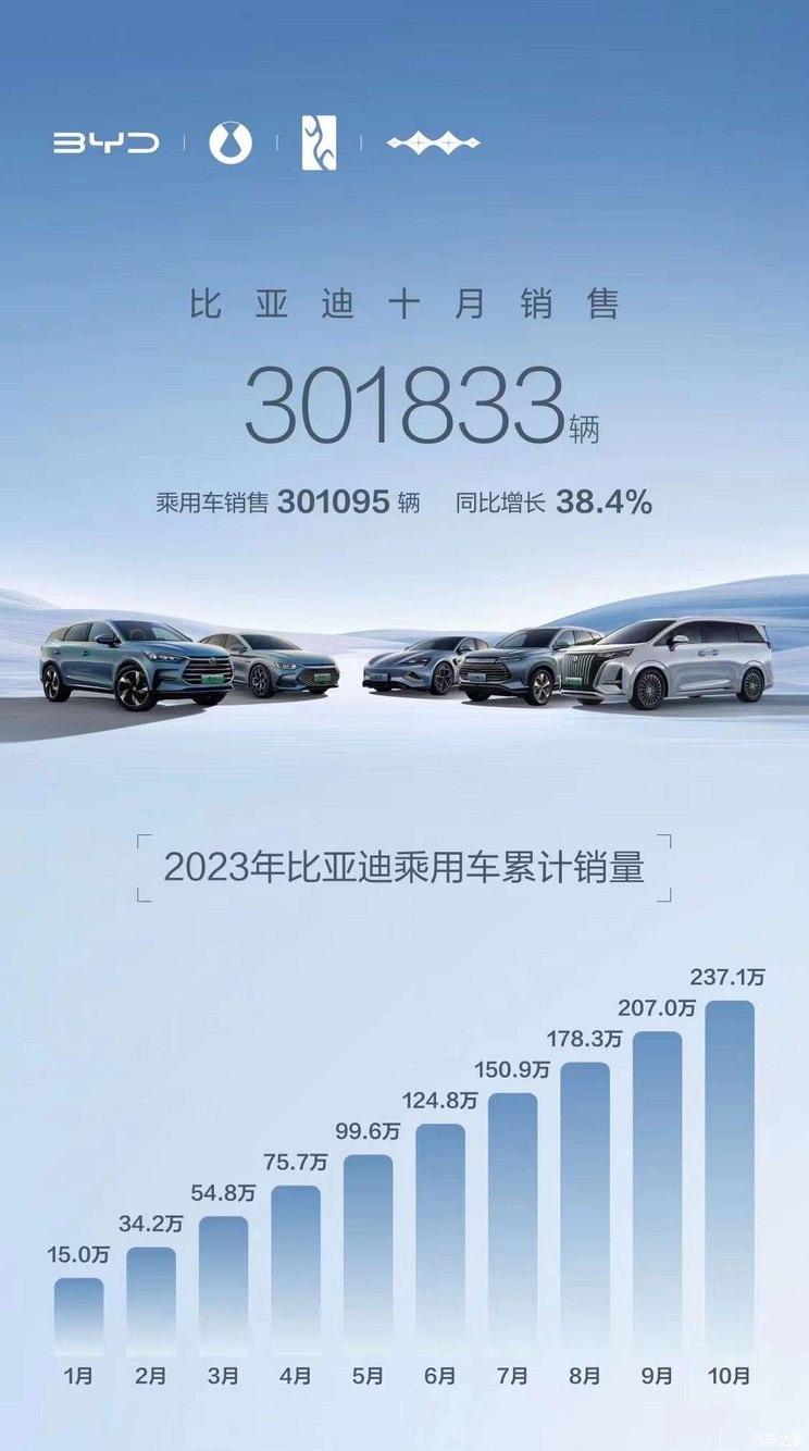 [本站 资讯] 11月1日,我们从比亚迪官方了解到,其10月共计销售301833辆,其中乘用车销售...