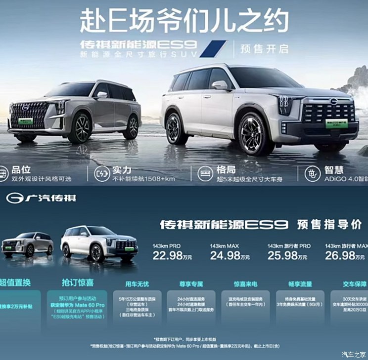 [本站 资讯]10月1日,广汽传祺ES9正式开启预售,新车共推出4款车型,预售价区间为22.98-26.98万...