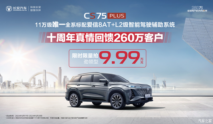 [本站 资讯] 5月24日,我们从长安汽车官方了解到,从即日起至5月31日,第三代CS75 PLU...