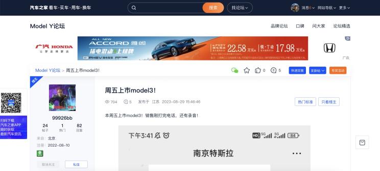 [本站 资讯]日前,本站论坛有用户爆料,9月1日新款特斯拉Model 3正式上市,消息来源于南京某特斯拉门店销...