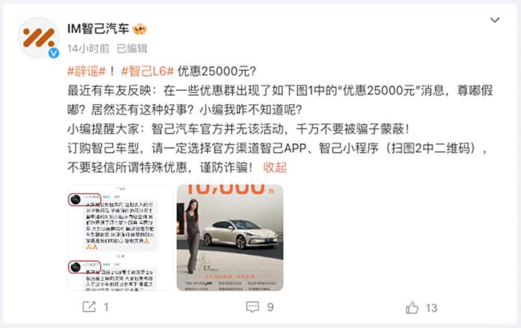 智己官方辟谣网传智己L6优惠25000元