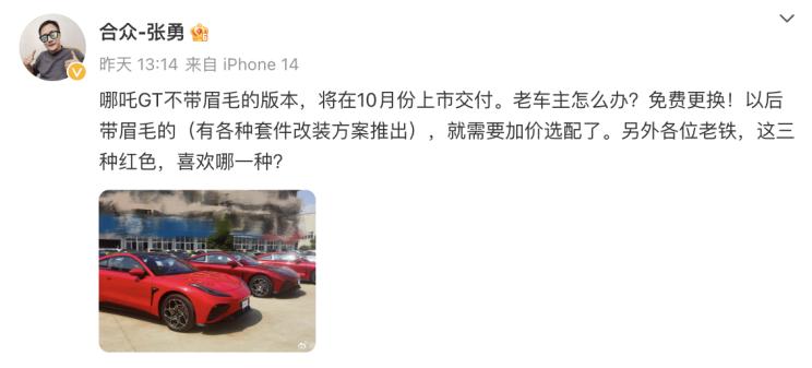 [本站 资讯] 日前,哪吒汽车CEO张勇在社交媒体上表示,哪吒GT新车型将10月份正式上市交付,新...