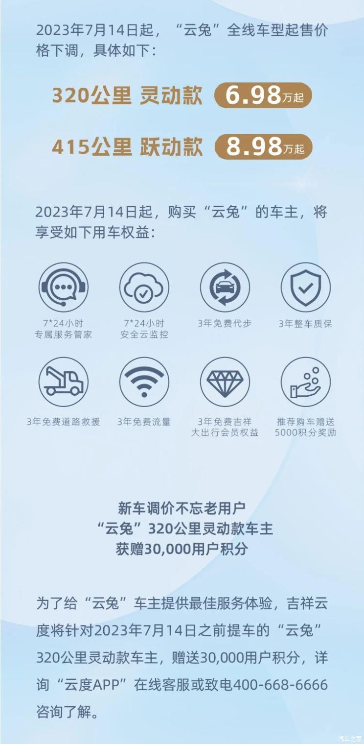 [本站 新车上市] 近日,吉祥云度决定全面下调“云兔”两款车型的价格,最大降幅达16000元。降价后新车共推出两款车型,...