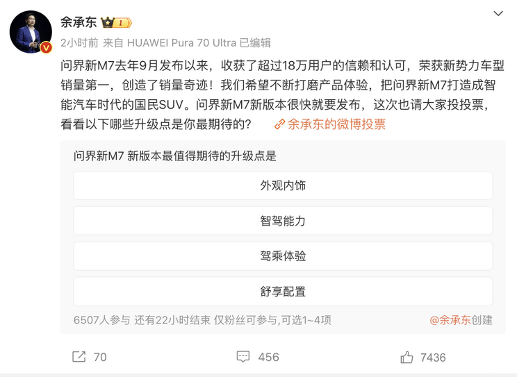 [本站 资讯] 日前,华为常务董事、终端BG董事长、智能汽车解决方案BU董事长余承东在社交媒体上表...