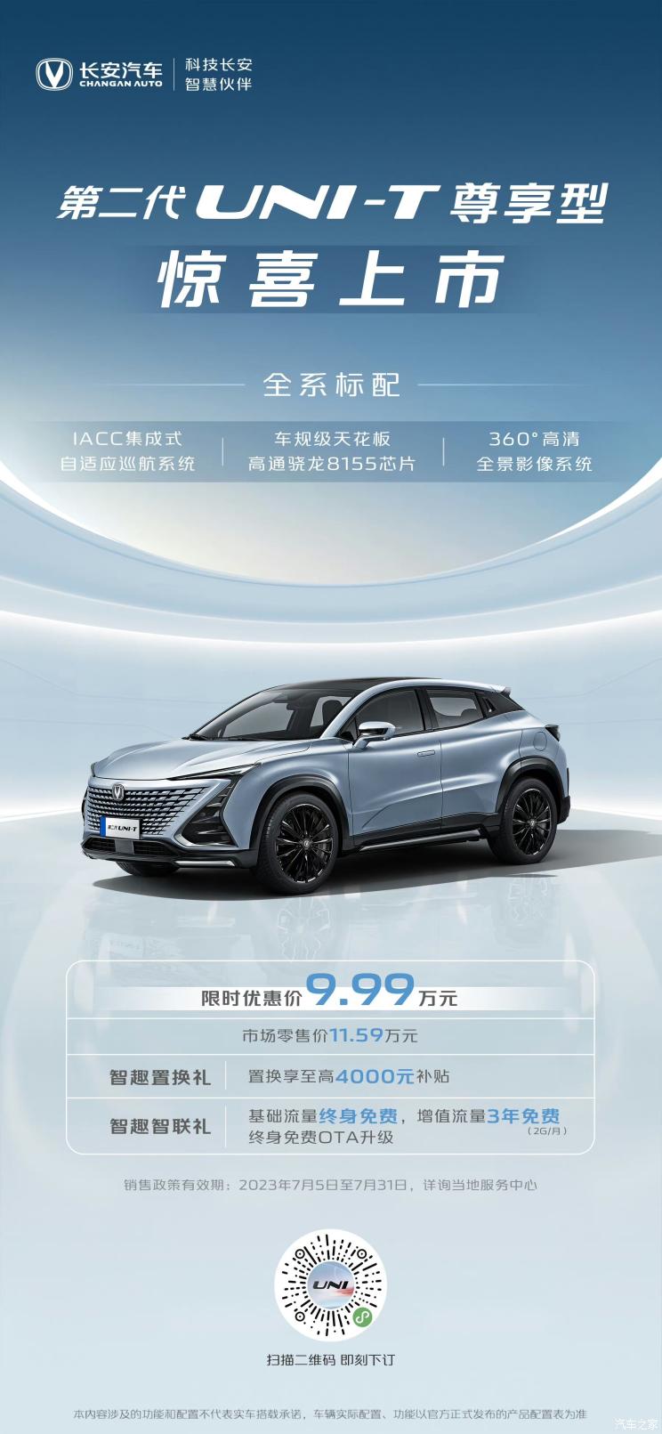 [本站 新车上市] 近日,长安汽车宣布,UNI-T尊享型正式上市,售价11.59万元。在7月5日-7月31日...
