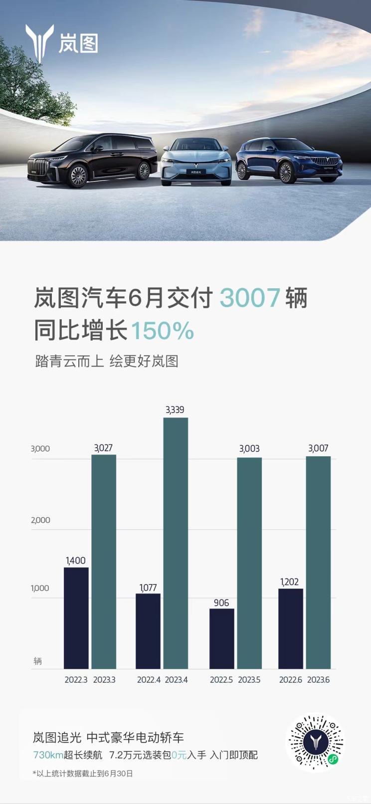[本站 资讯] 2023年6月,岚图交付新车3007辆,同比增长150%。岚图汽车自3月份以来连续四个月保持...