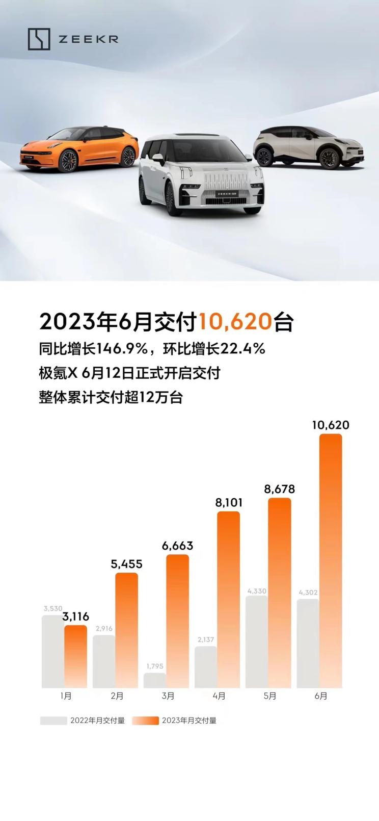 [本站 资讯] 7月1日,我们从官方获悉,极氪2023年6月交付10620台,同比增长146.9%,环比增长...