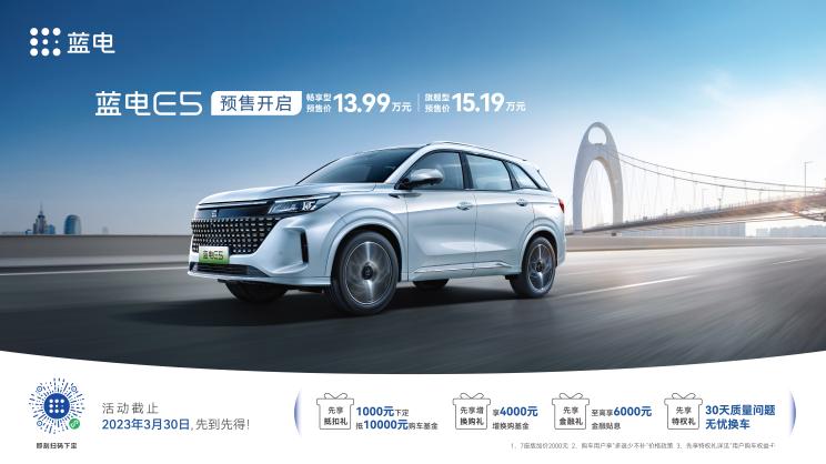 [本站 资讯] 日前,我们从官方了解到,定位为中型SUV的蓝电E5正式开启预售,新车共推出2款配置...
