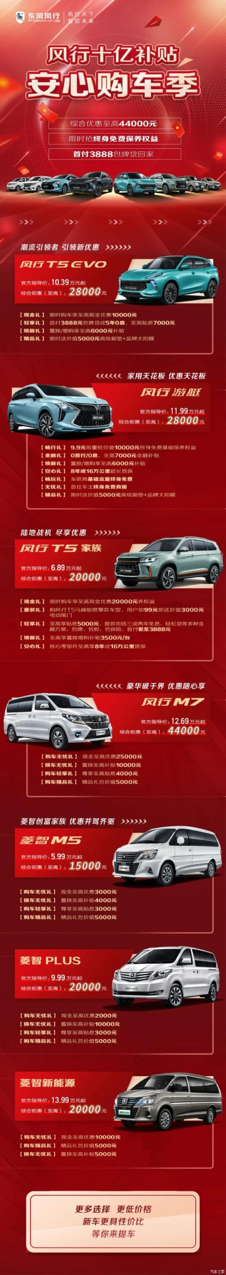 [本站 资讯] 日前,我们从官方获悉,东风风行发布十亿补贴优惠政策。综合优惠至高44000元,限时抢终身免费...