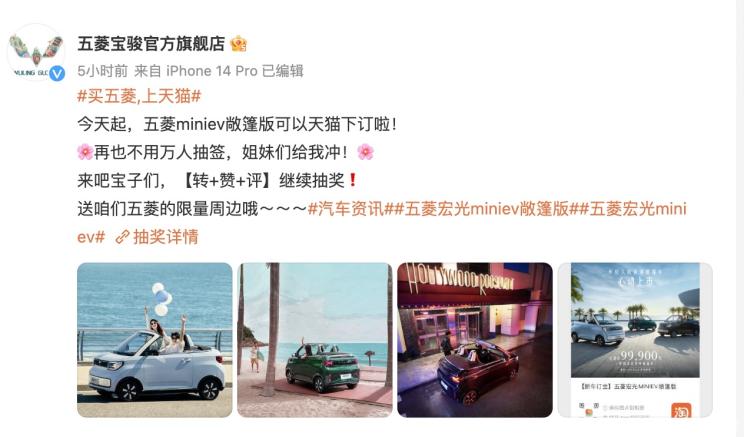 [本站 资讯] 日前,五菱宝骏官方旗舰店微博宣布,五菱宏光MINIEV敞篷版取消抽签,可以直接购买。 五菱宏...