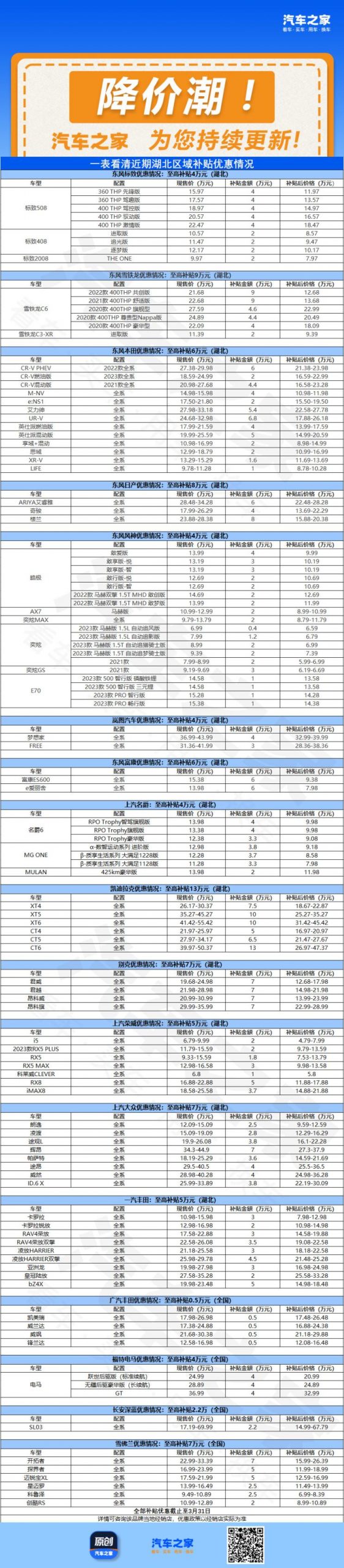 [本站 资讯]日前,多个汽车品牌与湖北政府联合推出补贴优惠活动,这一次,我们统计了针对湖北省及全国范围内17个...