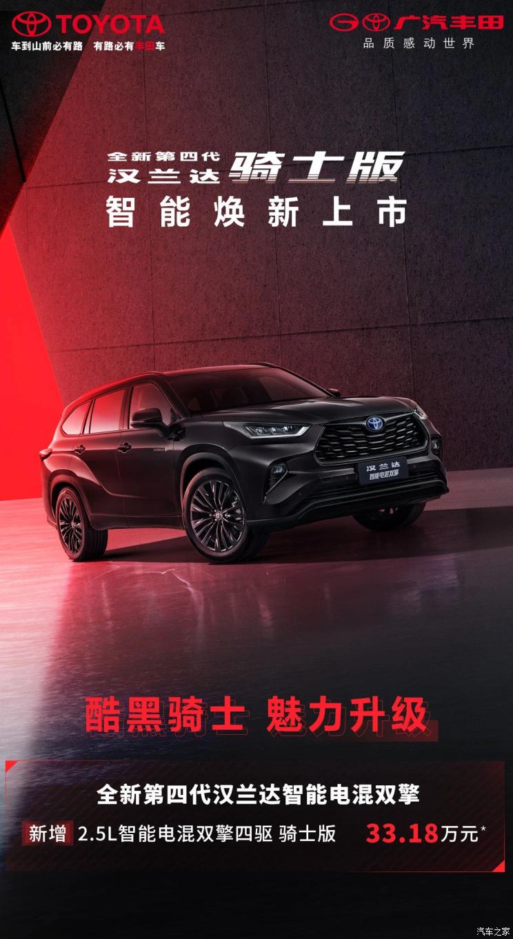 [本站 新车上市]3月4日,广汽丰田汉兰达双擎新增一款骑士版车型正式上市,新车售价为33.18万元。作为新增车...