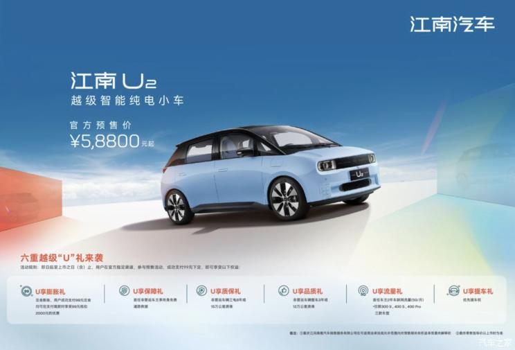 [本站 资讯] 2月13日,我们从官方了解到,江南汽车U2正式预售,预售价为5.88-9.98万元。该车是江...