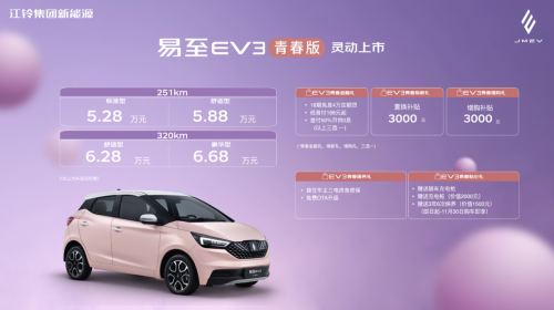 而且,购买易至EV3青春版还可以叠加享受青春金融礼、青春焕新礼、青春增购礼、青春服务礼、青春贴心礼等一系列上市抢先下定权益。如果以购买易至EV3青春版标准型计算,在使用3000元购车补贴和1111元的购车抵扣券后,仅需不到4.87万就能将车开回家,是最佳的“抄底”时刻。