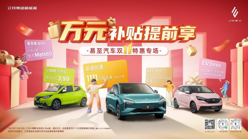 面对激烈的竞争,如何从中找到并抓住机遇脱颖而出呢?江铃集团新能源的选择是以“真诚换真心”。进入11月以来,江铃集团新能源在抖音重磅推出了“万元补贴提前享 易至汽车双11特惠专场”活动,旗下易至EV3青春版和小麒麟吉祥版等产品全线出击,为消费者们带来一场购车的狂欢盛宴。