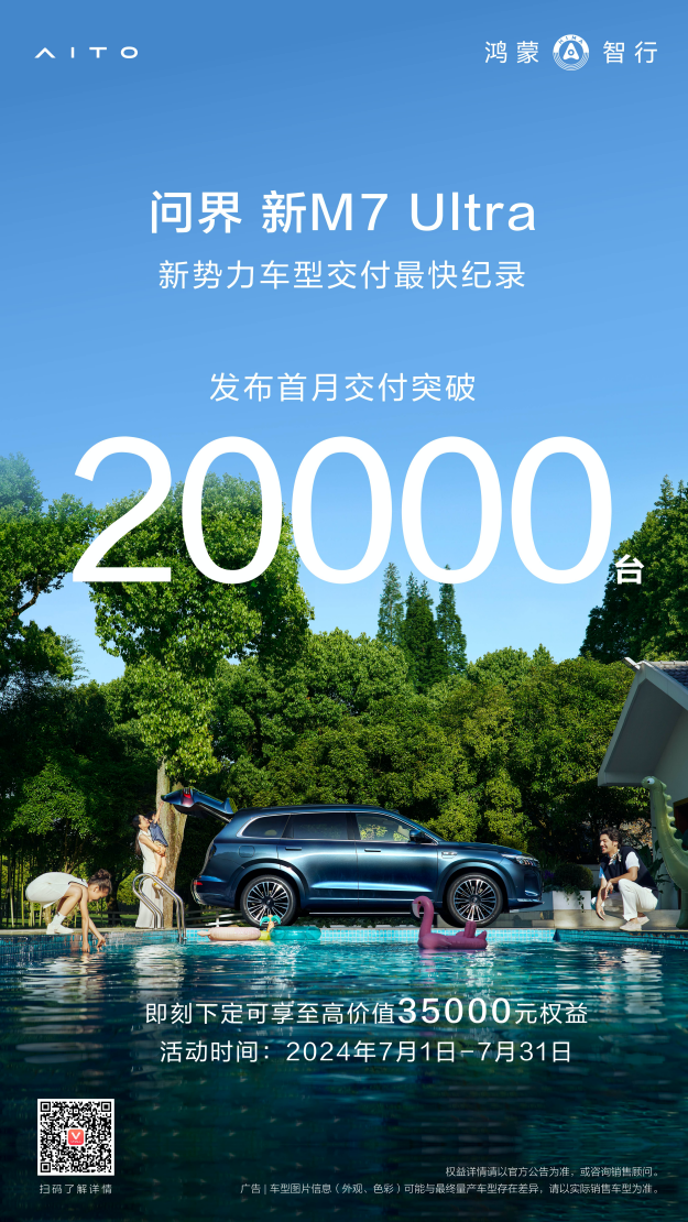 自上市以来,问界新M5、问界新M7 Ultra和问界M9就在不断刷新销量,展现出卓越的产品实力和市场竞争力。问界新M5上市仅一月收获2万台大定;问界新M7 Ultra上市首日大定破1.2万台,上市首月交付突破20000台,刷新新势力车型交付最快记录,问界新M7也由此成为2024年首款交付量迈向10万的新势力车型;问界M9上市六个月,大定数量达10万台。