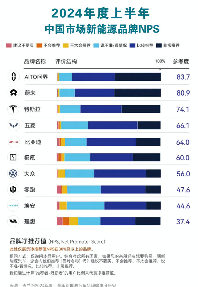 在今年第一季度,AITO问界销量跻身中国汽车市场豪华品牌第五,成为该榜单中排名最高的中国品牌。而在刚刚公布的2024年上半年中国市场豪华品牌NPS榜单中,AITO问界更是成功超过BBA、特斯拉等豪华品牌,以83.7%的NPS(品牌净推荐值),成功占据榜单首位。这一成绩,不仅充分展现了用户对AITO问界的高度认可,更反映出AITO问界在豪华汽车市场中的领先地位。