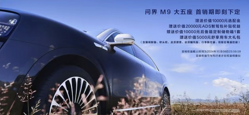 目前,问界还定制了一系列上市礼遇,10月8日前下定可享受价值10000元选配金及价值20000元ADS智驾包补贴权益,价值10000元后备箱定制储物箱1套和价值5000元舒享用车大礼包。同时,问界M9大五座面向定购用户开启先行者计划,限额1000名,2024年10月1日前陆续安排先行者计划车辆发运和交付,10月中旬开启规模交付。