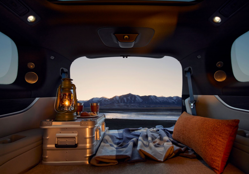 此外,大空间也带来了更强的载物能力和更多玩法。常规状态下,后备箱容积已高达1043升,可轻松装下4个28英寸行李箱、1个高尔夫球包和其他物品,满足旅行、露营全家储物需求。如果将二排座椅放倒,则可以得到一个进深超过2米、容积达到2122升的平坦空间。此外,还配置了硬质遮物板及双滑轨,可选装多功能装载托盘、山海坐席等专属定制化配置。在这样的加持下,后备箱成为了一个单独的私人空间,无论是在野外仰瞰星辰,还是在湖边自由垂钓,都为车主提供了极高的情绪价值,说其尊贵感媲美劳斯莱斯也不为过。