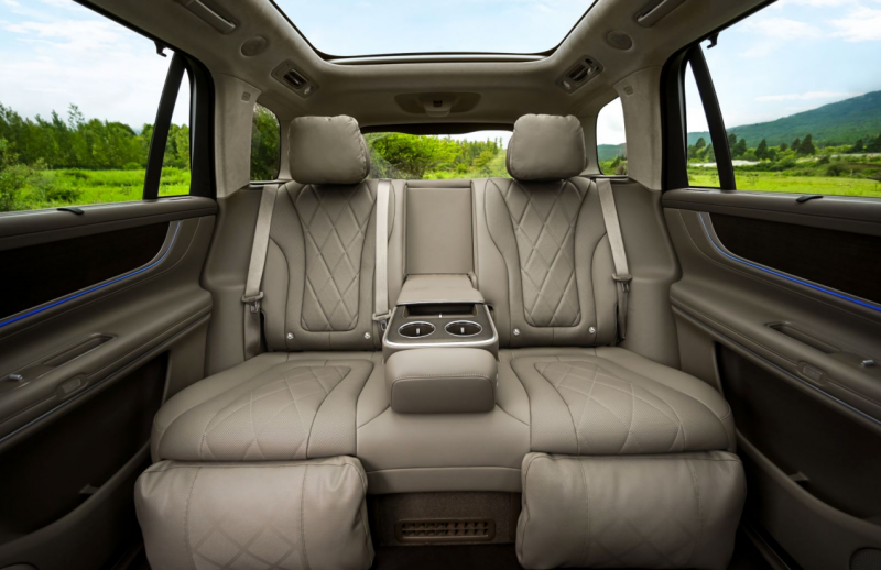 五座版车型最大的亮点要属同级领先的极致大空间,根据官方公布的数据,其车内总乘用空间达到3500mm(超过劳斯劳斯库里南)。由于移除了第三排座椅和过道,第二排乘客的腿部空间最大达到了1985mm。另外,还全系标配舒云座椅,具备加热、通风、按摩功能,二排座椅支持四向电动调节双腿托,最大调节角度达75°,座椅靠背最大调节角度达43°,配合柔软细腻的头枕、腰靠,乘坐感受非常舒适。