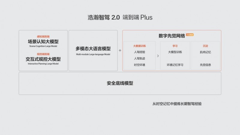 ●  极氪全栈自研浩瀚智驾2.0端到端Plus架构,将原有的场景认知大模型和交互式规控大模型,进化引入了全新的数字先觉网络和多模态大语言模型,让系统犹如本地老司机,表现更胜一筹。