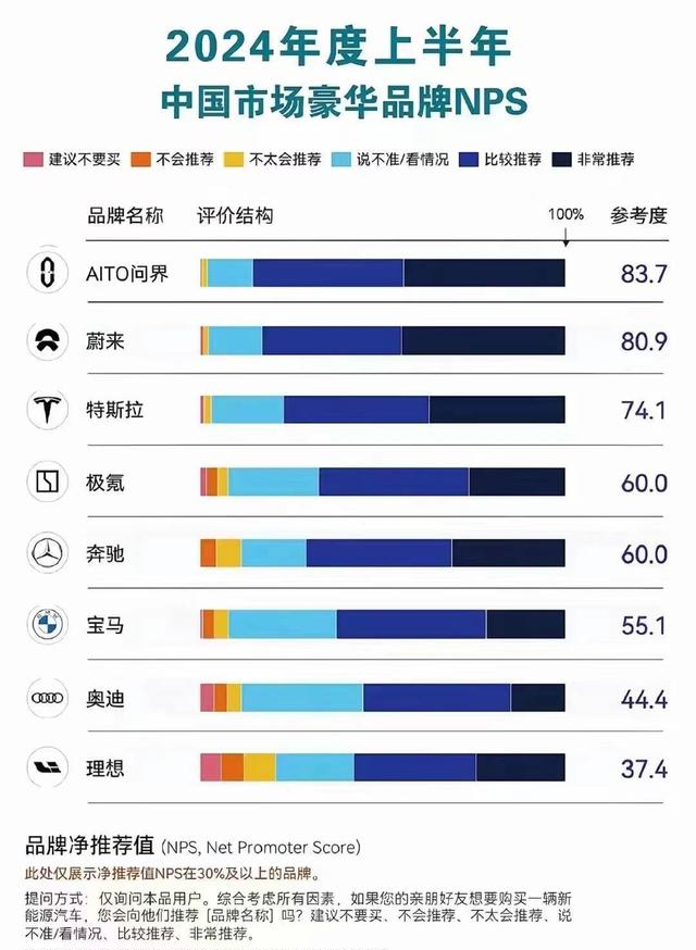 基于优秀的市场口碑,问界在2024年上半年中国市场豪华品牌NPS榜单中,超过BBA、特斯拉等豪华品牌,以83.7%的NPS(品牌净推荐值)成功占据首位。