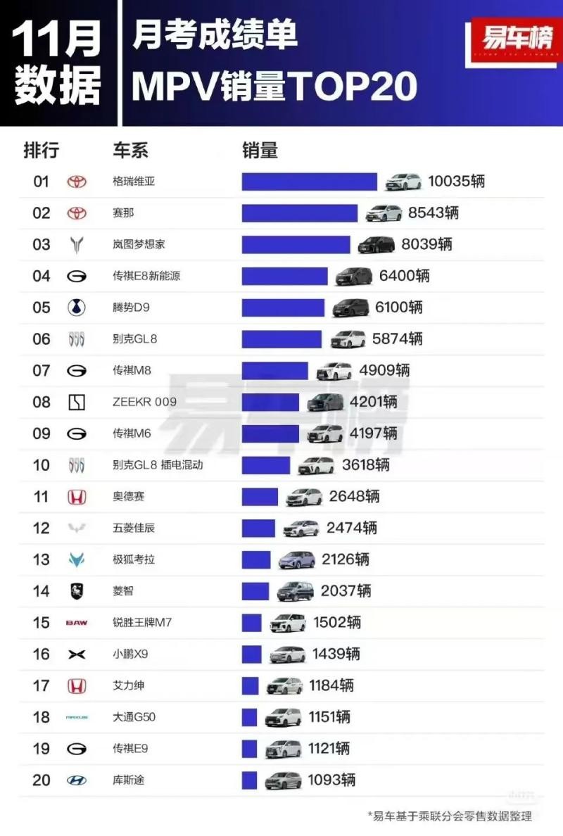如果说在售车型还有什么是细分市场的蓝海,那可能只有MPV这个选项。各家车企利用在轿车和SUV产品上的新能源技术积累,纷纷推出了定位旗舰产品的MPV车型。有些意外的是,在本月初易车根据乘联分会零售数据整理公布的11月MPV销量排行榜上(如下图),占据销量前二的竟然是丰田的两款蓝牌车型。