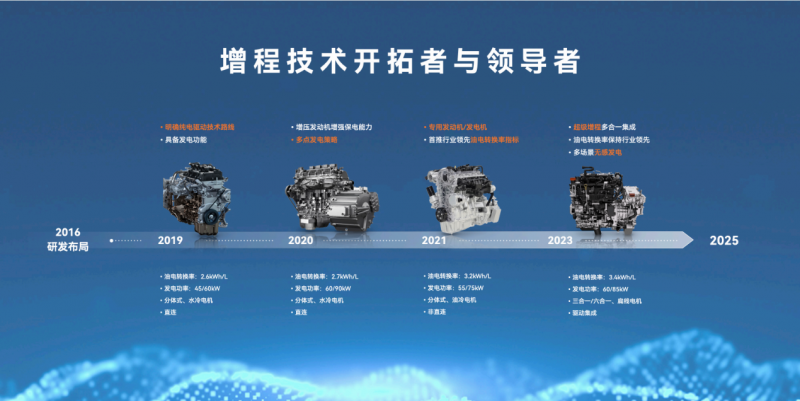 其一是增程专用发动机,通过高滚流比、高压缩比、高EGR率、高能点火、高效增压和低泵气损失、低摩擦等技术,热效率较传统发动机提升了4~6个百分点。