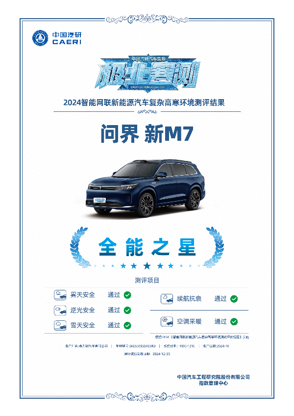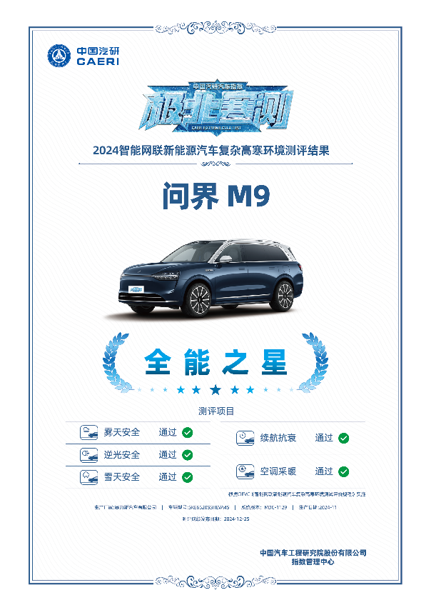 不出意外,问界以优异的成绩为2024年画上圆满的句号。其中一项高分,是“汽车测评国家队”中国汽研对问界应对复杂高寒环境实力的认可。在2024中国汽研汽车指数“极北寒测”中,问界M9和问界新M7无惧零下25°低温环境的全部测试挑战,斩获“全能之星”荣誉称号,问界也荣膺全场唯一的“卓越品牌”称号。