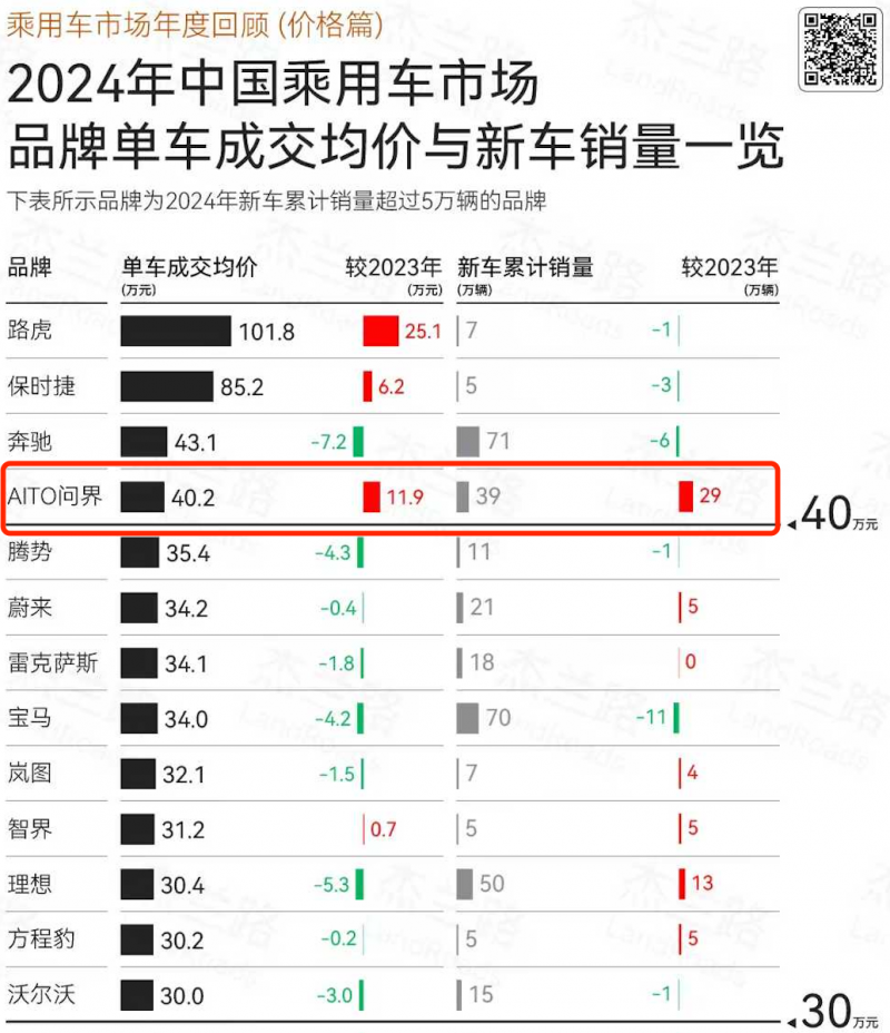 秉承“智慧重塑豪华”的品牌宣言,问界自2021年底发布以来仅三年多时间,已有超过50万问界用户,销量不断刷新市场纪录。数据显示,问界位列2024年国产品牌单车成交均价第一,也是均价超过40万元的唯一国产品牌。