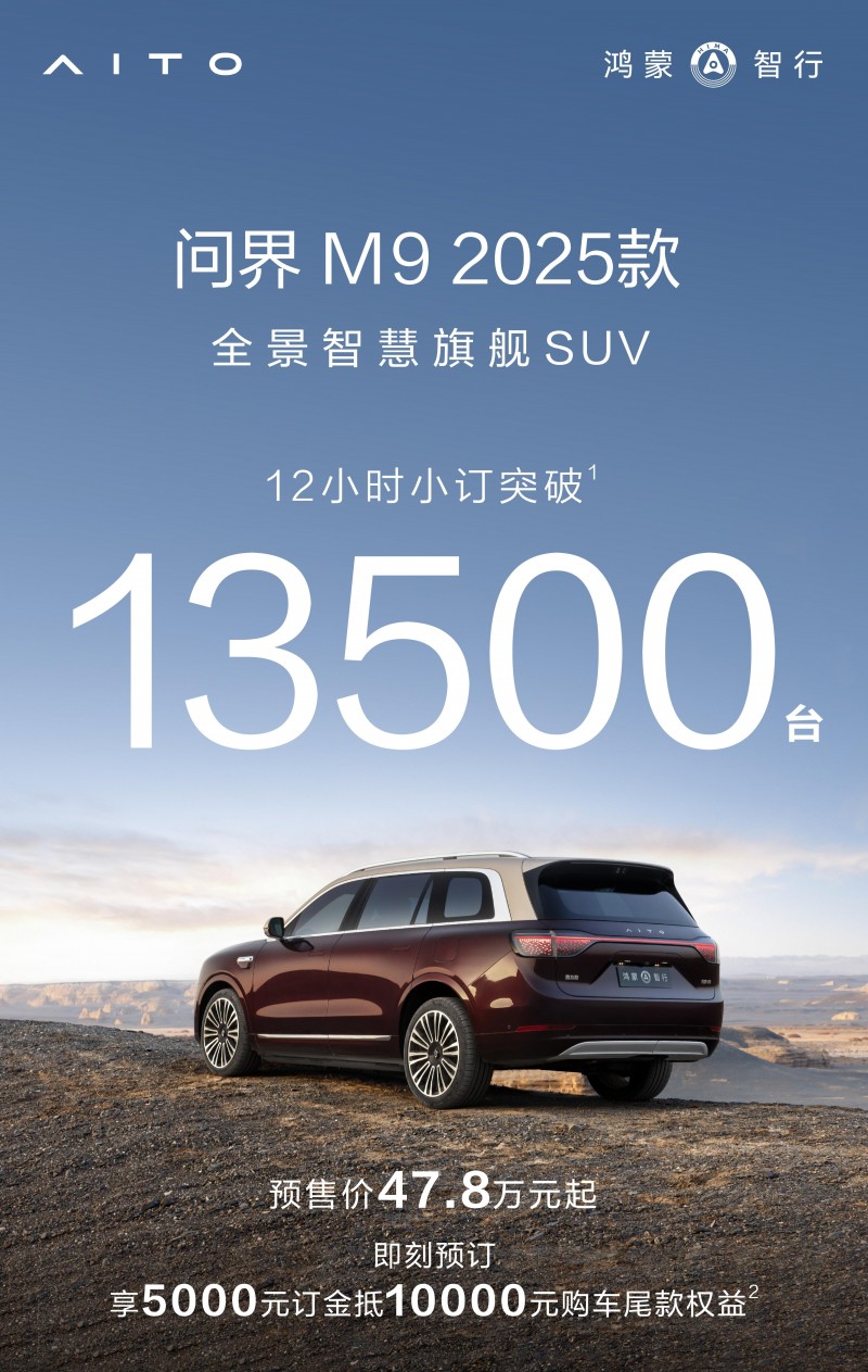 欢迎转载,请注明出处:全球电动车网 » 12小时狂揽超13500台订单,问界M9 2025款首日预售火爆!