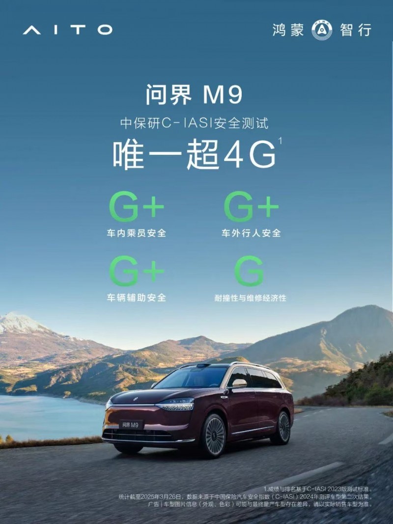 为保障产品品质,问界还会对新车进行全面严苛的测试,多项测试标准远超行业。问界卓越的产品实力也赢得了行业的高度认可。问界M9继去年获得C-NCAP超五星安全认证后,今年又获得中保研C-IASI安全测试中“唯一超4G”安全认证,成为国内两大权威机构共同认证的安全标杆。