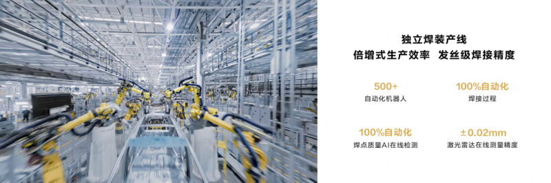 为保障问界M8的规模化交付,赛力斯超级工厂新建了独立焊装产线,引进了创新的工艺和装备,并践行绿色低碳制造理念,可再生能源使用占比超过41%。新建的M8焊装产线,应用超过500个自动化机器人,焊接过程100%自动化,焊点质量AI在线检测100%自动化,实现生产效率倍增。引进的激光雷达在线测量,测量精度可控制在±0.02mm,比头发丝还细。