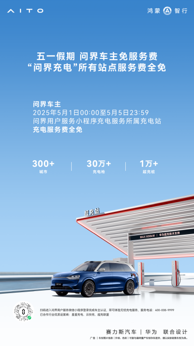此外,为回馈用户的支持,问界还在五一小长假期间推出一项重磅福利:即日起至5月5日23:59,问界用户服务小程序充电服务所属充电站充电服务费全免,覆盖全国300余座城市的30万+充电桩(含1万+超充桩),进一步降低用户的补能成本。