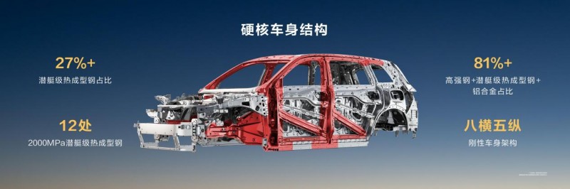 具体来看,全车采用“八横五纵”笼式车身,以高强材料确保硬核安全,共有12处2000MPa潜艇级钢,铝合金、高强度钢、热成型钢等高强材料占比超81%。同时,问界M8采用9800吨一体压化压铸工艺,配合9个安全气囊和16个安全点位等设计,带来一排、二排、三排都安全的超五星安全体验。