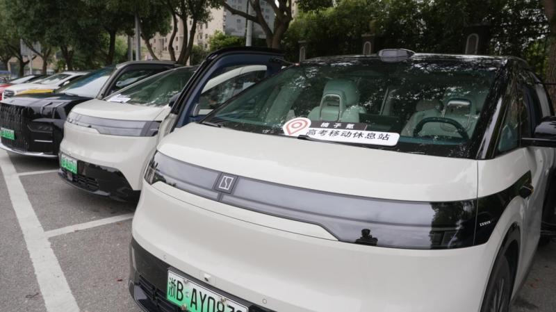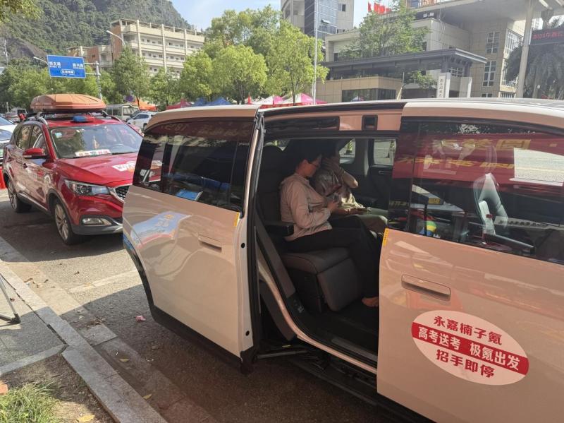 记者看到,志愿者们的极氪009、极氪MIX、极氪7X,停在考场外,车里冰箱冷饮、电视大屏一应俱全。建哥热情招呼候考家长过来休息,一位家长甚至在车里看起张雪峰的报考指南。