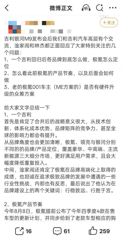 对此,业内人士分析,真诚是压舱石,品牌的真诚终将赢得用户真心,极氪要打造用户型豪华品牌,除了坚持品牌向上,更要坚持用户至上,通过坦诚沟通,和用户建立长期的品牌互信。
