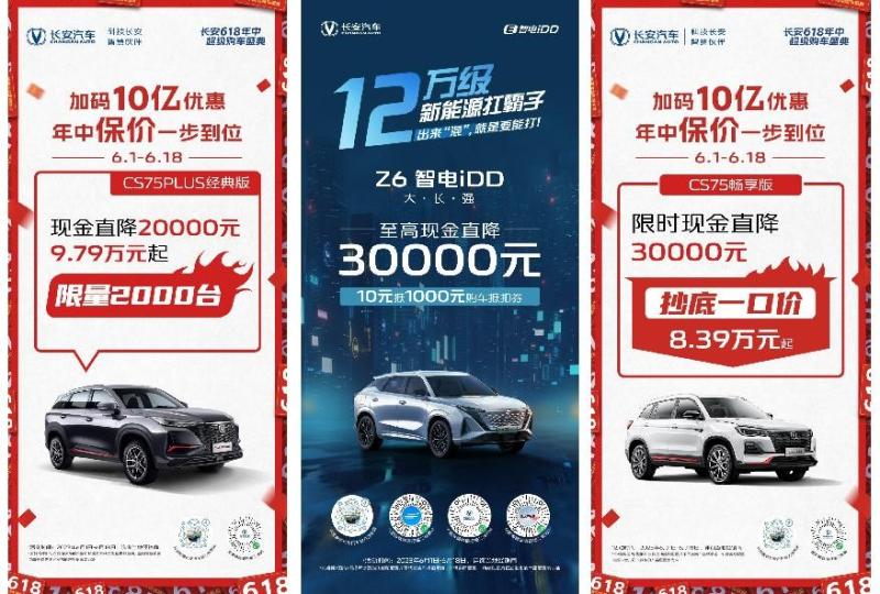 强悍的霸榜产品力做支撑,创新花样的营销玩法做助推之外,长安汽车更是让利于广大消费者,6月1日起,“长安618年中超级购车盛典”已全面开启!一大波经典王炸车型摊牌见底,持续疯狂开挂补贴。CS75PLUS经典版现金至高直降20000元,9.79万元起就能将车开回家,仅限量2000台。“新动力严选SUV”CS75畅享版更是抄底一口价,仅需8.39万元起,享现金直降30000元。长安新能源车型福利持续加码,“12万级新能源扛霸子“长安Z6 智电iDD享至高现金直降30000元,更有10元抵1000元购车折扣券等你抢。