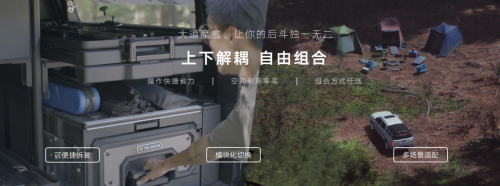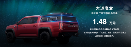 大道魔盒也开启预售并在10月起陆续交付,大道敢探者、大道追光者、大道飞将,均可选配。魔盒基础版厂家预售指导价格为:1.48万元(包含后斗箱体及车顶帐篷,如需选配内部组件,如托盘、抽屉、边柜等可在线上及经销商门店自由选购)。